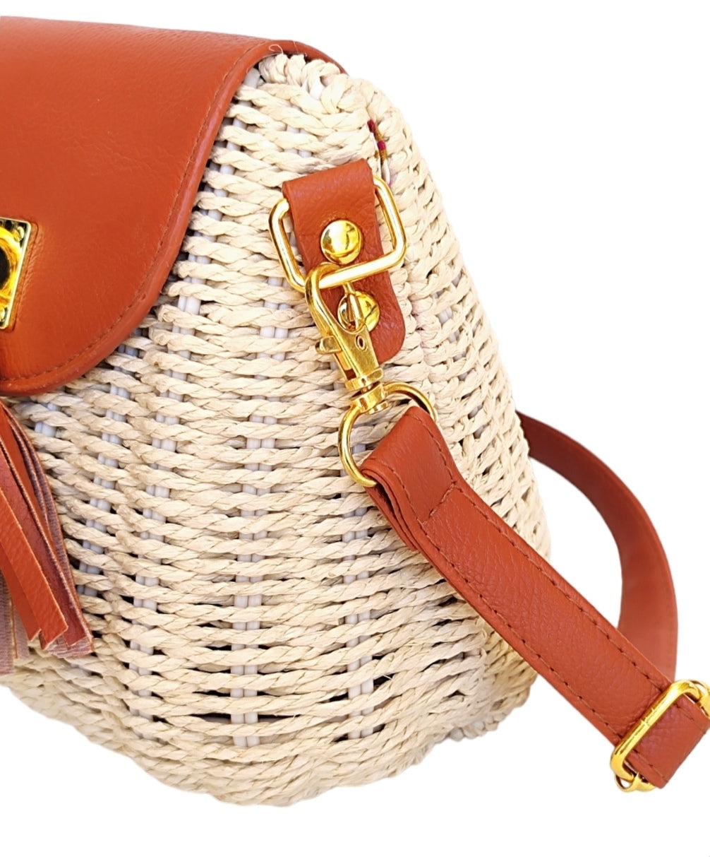 Γυναικεία οβάλ τσάντα ψάθινη με μακρύ λουράκι που προσαρμόζεται σε μπεζ χρώμα
