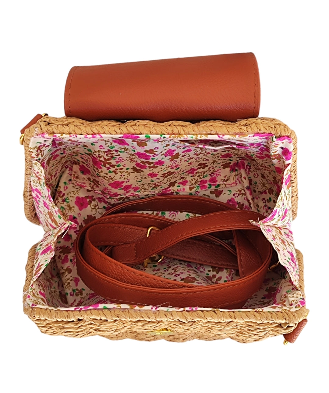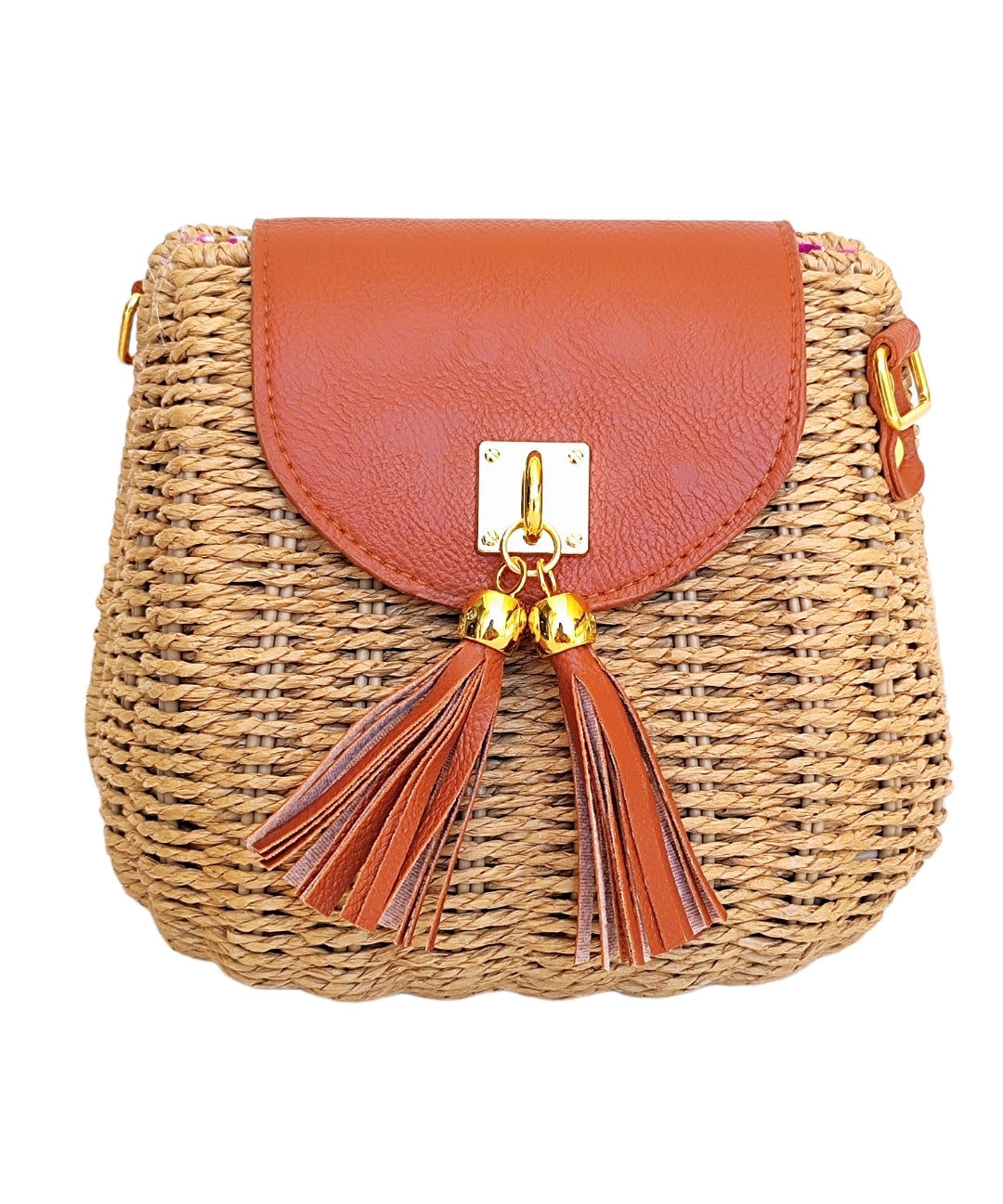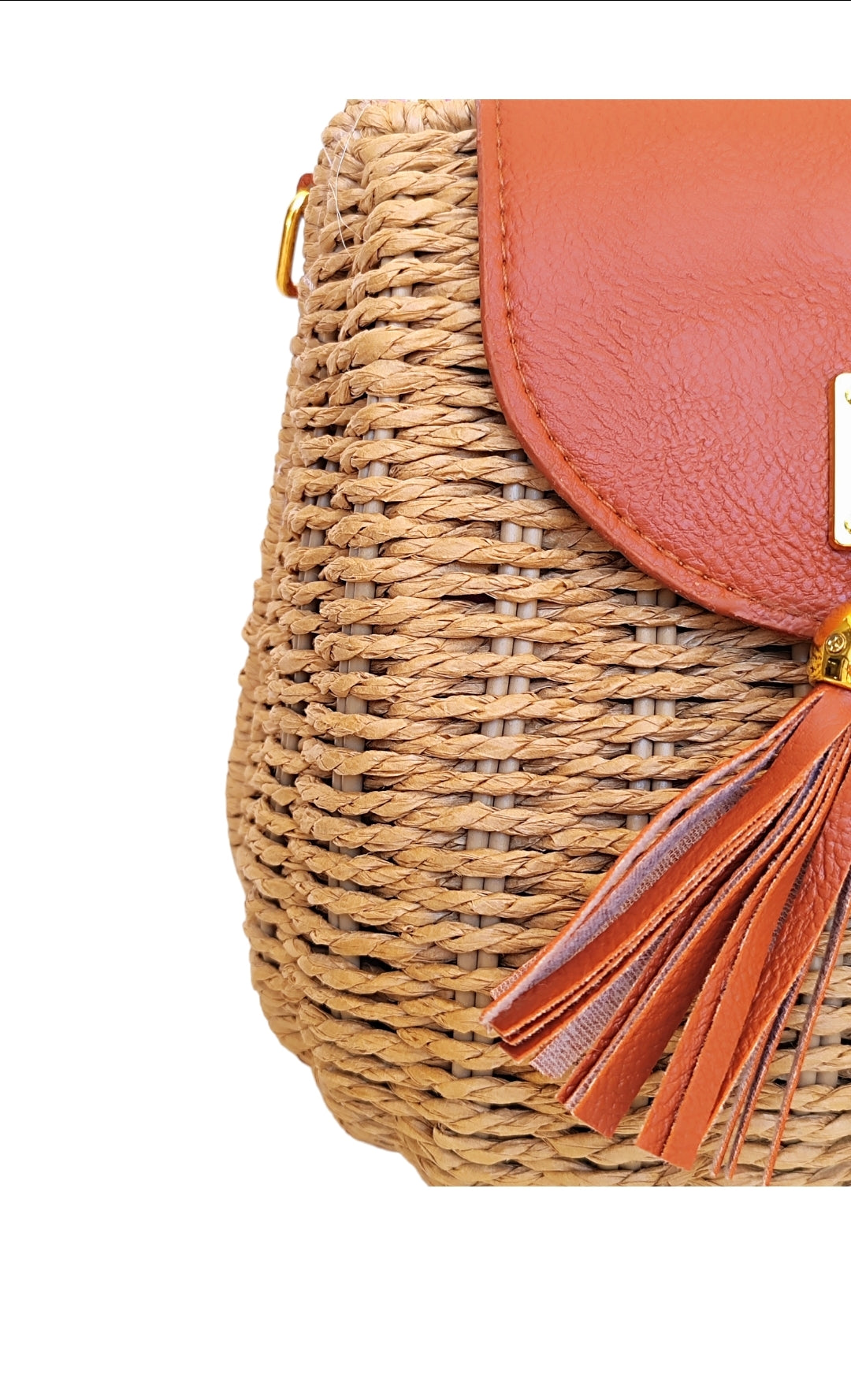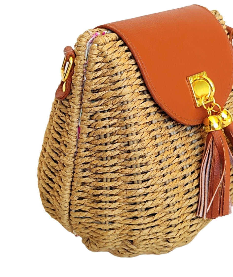 Γυναικεία οβάλ τσάντα ψάθινη με μακρύ λουράκι που προσαρμόζεται σε σκούρο μπεζ χρώμα