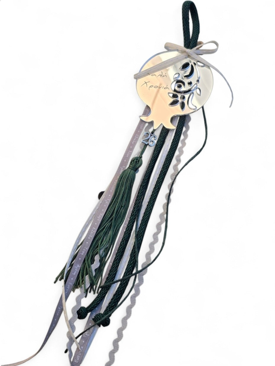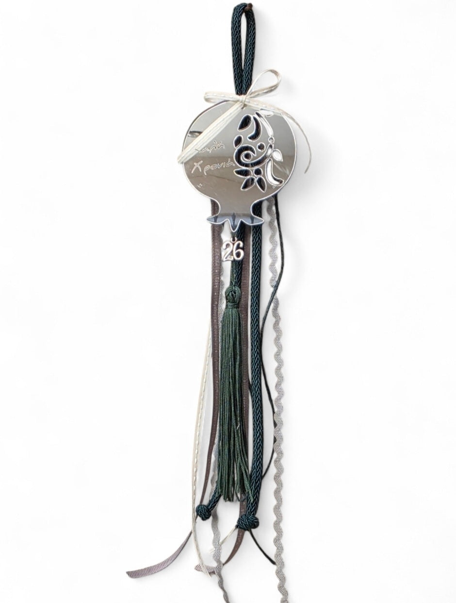 Χειροποίητο κρεμαστό γούρι ρόδι σε ασημί καθρέφτη