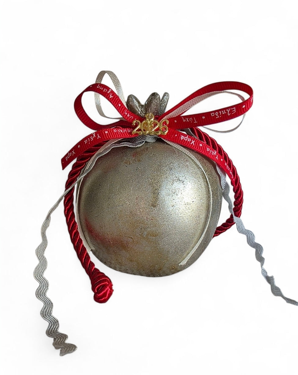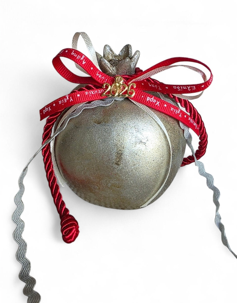 Χειροποίητο γούρι σε σχήμα ροδιού ασημένιου χρώματος, μεγάλου μεγέθους
